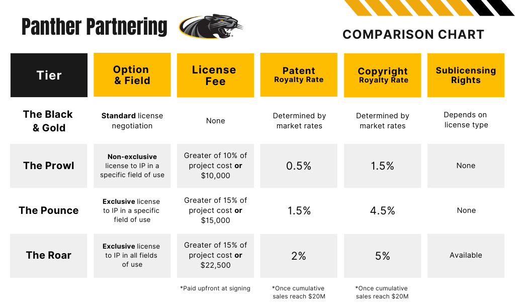 When a company is interested in conducting a research project with UWM faculty, they can lock in up-front specific royalty rates for a flat fee on top of the costs of the research. These rates are lower than the rates normally utilized for comparable deals for early-stage technologies. Any license will require that the company pays all patent costs. Royalties will only be paid to the university once the licensed product is proven to be successful, with a cumulative net sale of $20 million.